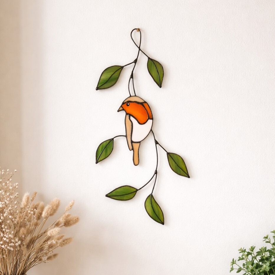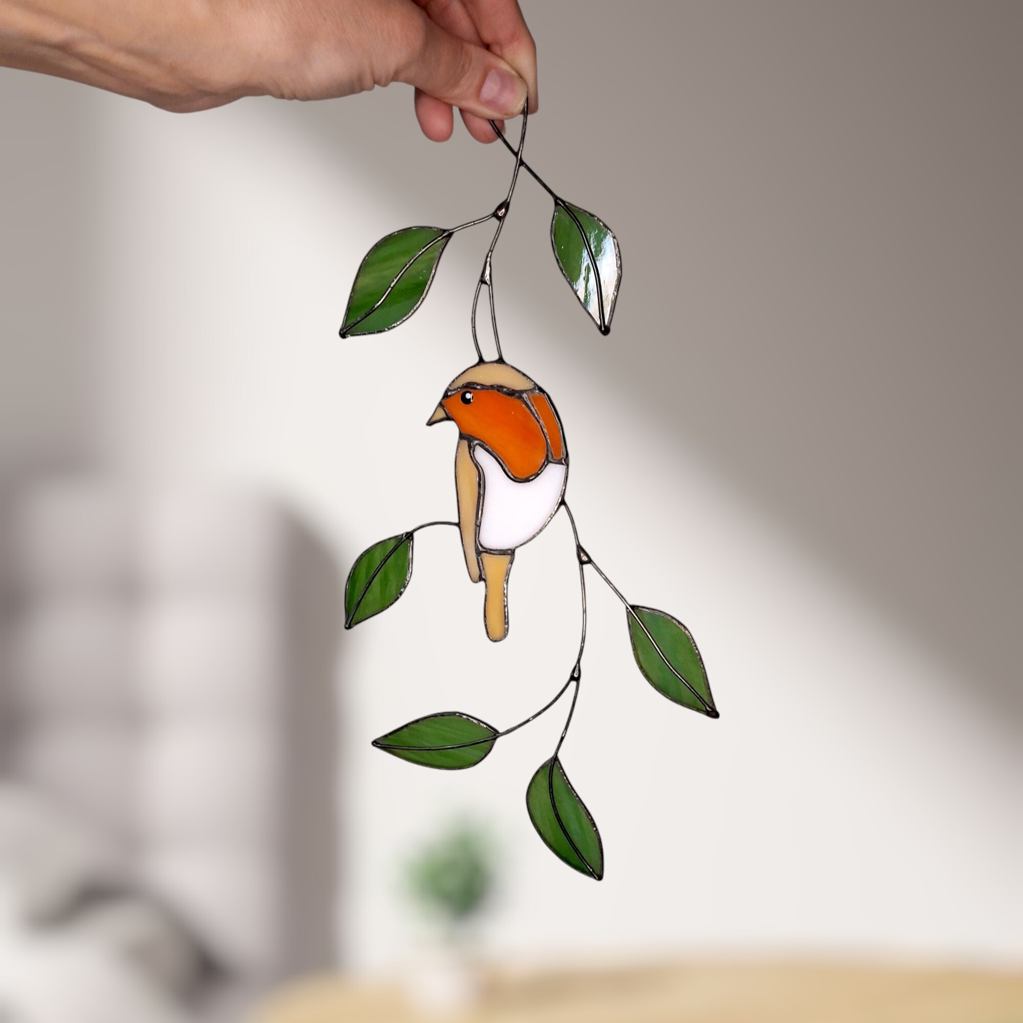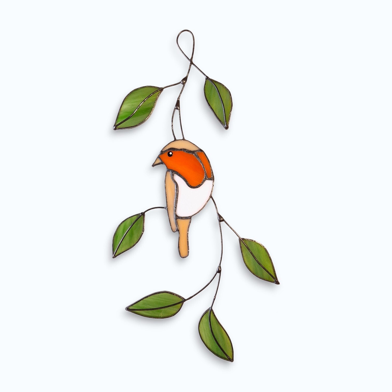 Ręcznie wykonany witraż w technice Tiffany przedstawiający rudzika siedzącego na delikatnej gałązce z zielonymi listkami.